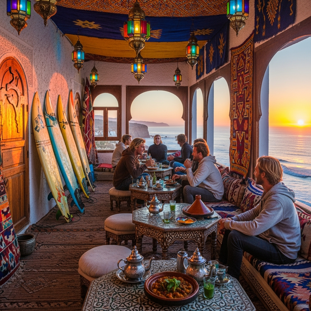 Quand vous n’êtes pas sur la planche, flânez dans les ruelles de Taghazout, dégustez un thé à la menthe face à l’océan ou savourez un tajine de poisson frais dans un petit restaurant local. Le charme du village, c’est aussi sa simplicité et son ambiance bohème.