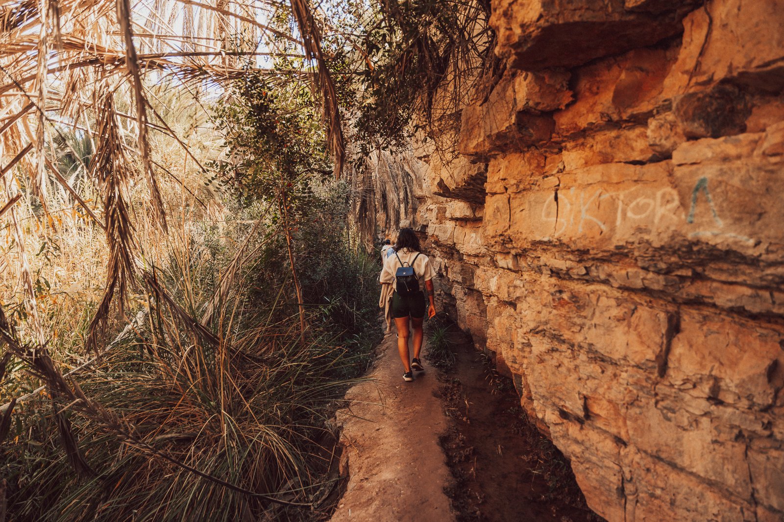 The scenic hiking trail winds through palm trees, olive groves, and rocky landscapes. It’s not too difficult, making it ideal for beginners and families.